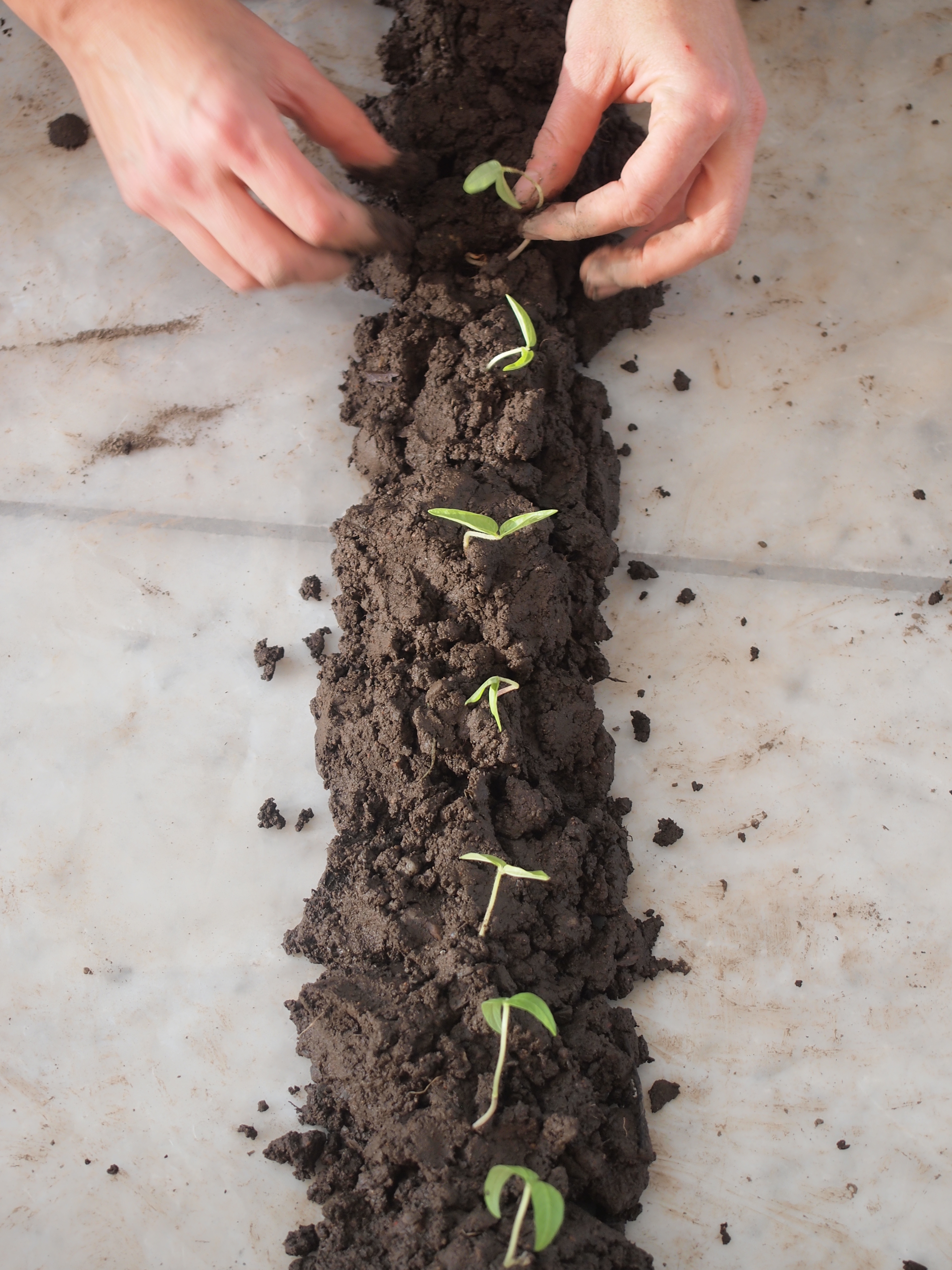 The second half is a planting ritual in which a field of seedlings is planted and tea is served to the audience, the goal of which is to transform the performance space into a mini-field. Through the creation of this mini-field, the audience is able to witness a durational process of tarps being laid out, rows of soil being created, and seedlings being planted. As the process unfolds, the audience is served cups of herbal tea, and invited to sit on the field or on the floor around the stage space, creating a kind of post-apocalyptic lounge/tea party/occupy encampment. At the end of the evening, audience members are offered seedlings to take home (in their cups) as a way to give them a lasting piece of the process of the evening.