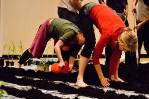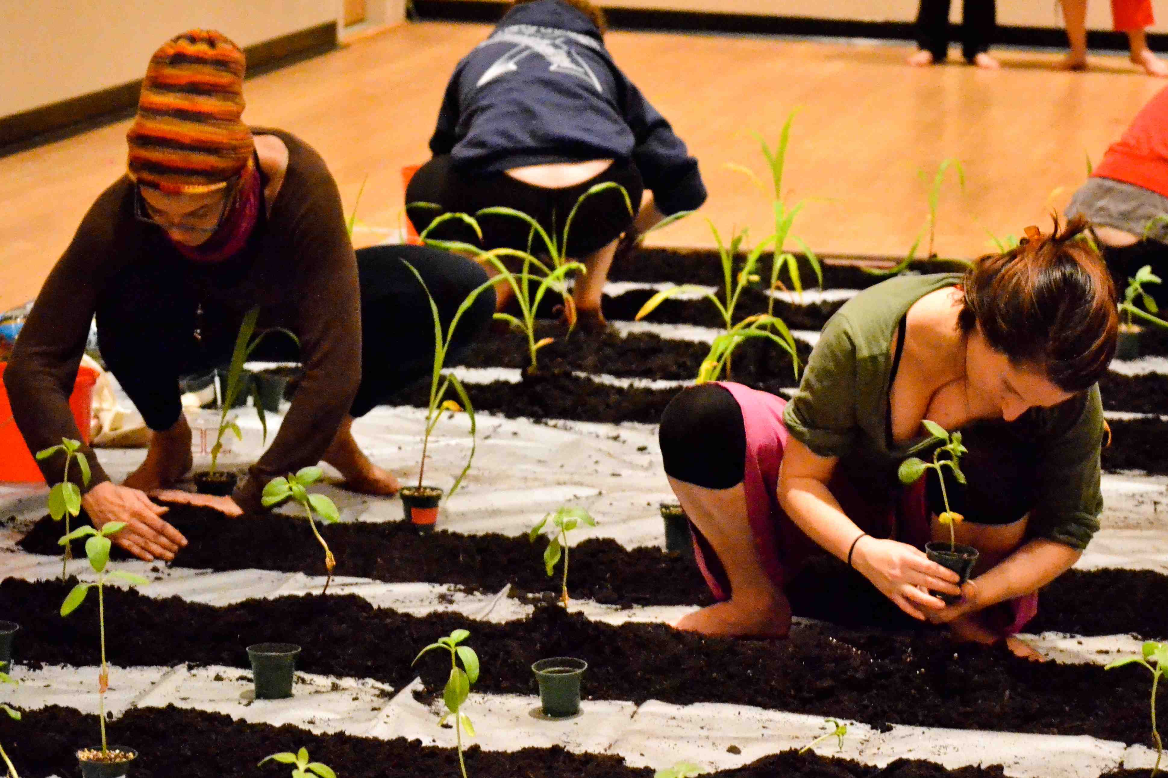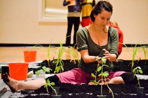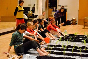 Jill Sigman has a way of inspiring carpe diem in her subjects. Upon entering Schonberg Dance Studio on Saturday, Jill directed us to walk around and “get to know the room.” We walked fast, we ran, we filled the space, we bent down and smelled the floor. My mind could only wonder for a second before I remembered where I was: lying on the floor, inspecting the grains in the wood at Jill’s direction. Later we filled containers to the brim with water, until their meniscuses were convex. While walking around holding one of these containers and trying not to spill, it was impossible to focus elsewhere. And what if we traded our water-filled containers with one another? So much to think about! Whether it be through the physical—tasking us to build a field of sunflowers and ornamental corn on a tarp taped to the floor of the dance studio—or through thought—what is a field?—my experience stood apart from the often routine nature of life as a student. So thank you Jill, for spending eight straight hours, for commanding that block of time, for confining me to the present moment.