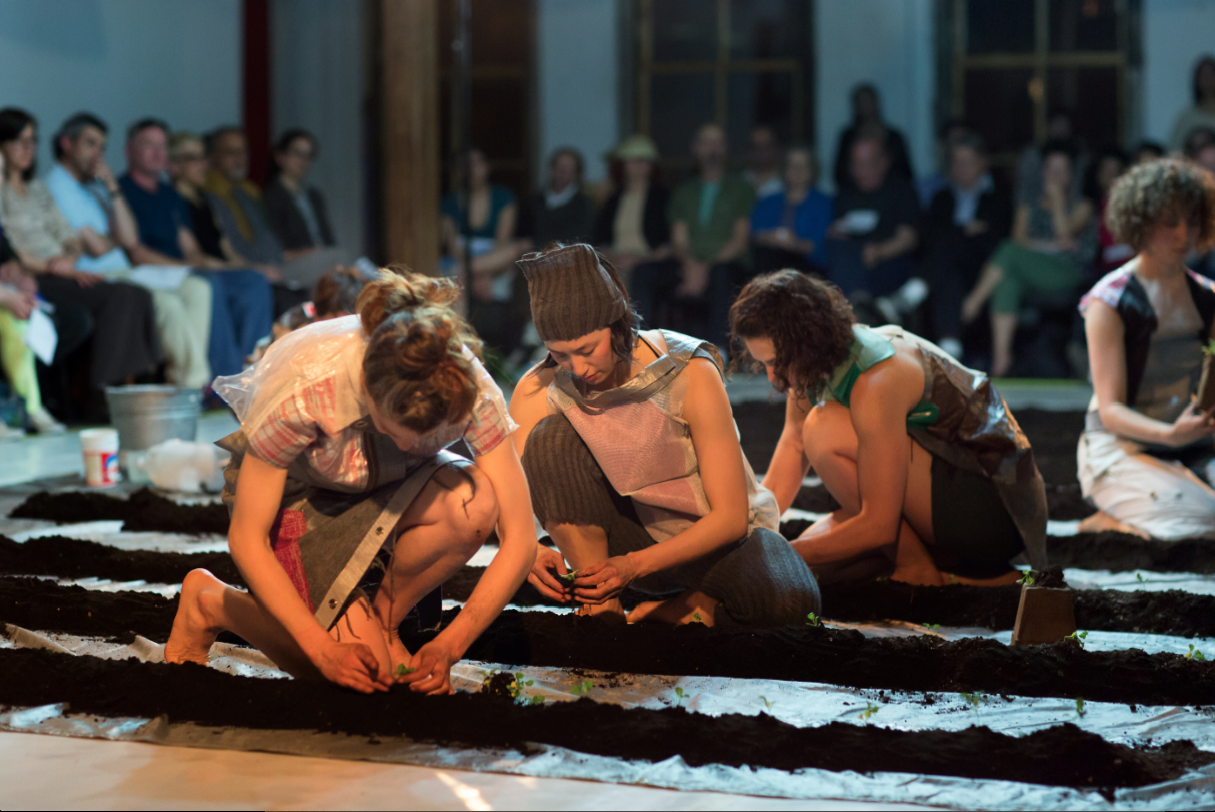 During the process, the dancers and I visited a number of small, educational or community farms– among them Red Hook Community Farm and Eagle Street Rooftop Farm in Brooklyn, Battery Urban Farm in Manhattan, Sylvester Manor on Shelter Island, and the Center for BioRegional Living in Ellenville, a site for permaculture education. It felt fitting to share the act of planting which we have both witnessed and experienced with an audience as an act of our own affection.