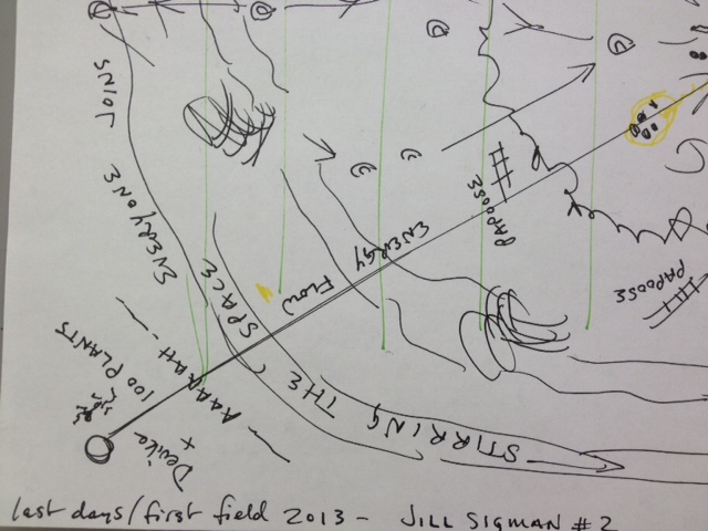 The dancers and I have been reflecting on these questions through our shared practice. It has been a practice that swallows everything—work with movement in the studio, visits to farms and green spaces (weeding, planting, dancing), Arctic stones, our experiences of Hurricane Sandy and the fallen branches we have collected, our observations of hipsters on the L train, our reading about fields and food and rituals, our own real estate and economic tribulations, and finally, our being with you here now. last days/first field questions and exorcises and connects and reminds. It is simultaneously a dance, a durational ritual, and a part of real life.  –Jill Sigman, May 2013