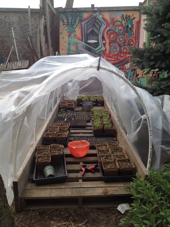 This spring, I commissioned two young farmers, Henry Sweets and Camilla Hammer, to plant our seedlings. They grew kale and basil in a cold frame built by Henry in a backyard in Bushwick, as you can see in the pictures below.  Thanks to Henry and Camilla, the seedlings grew into sturdy little performers.  Back up crops of organic basil and blue corn were also grown at Wesleyan University by Jeff Gilarde, who runs the Wesleyan greenhouse. Through the kindness of Jeff and the Center for the Arts, we knew we’d have plants even if the outdoor crops in Brooklyn were to fail. Basil and corn were transported to Brooklyn on May 9 and delivered by the generous help of Professors Bill Johnston and Lori Gruen and fellow Creative Campus artist Eiko Otake! So for our May 9 performance we planted three crops (kale, corn, and basil) which audience members took home to their yards and windowsills after the show.